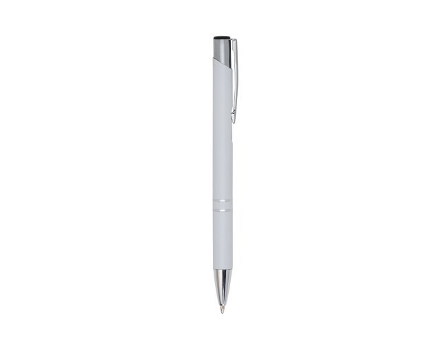 Caneta metal inteira colorida com detalhes prata. Clip metal com a ponta do acionador preto, parte inferior com dois anéis prata. Aciona por clique.