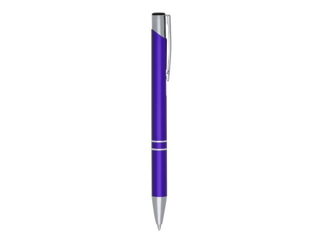 Caneta metal inteira colorida com detalhes prata. Clip metal com a ponta do acionador preto, parte inferior com dois anéis prata. Aciona por clique.