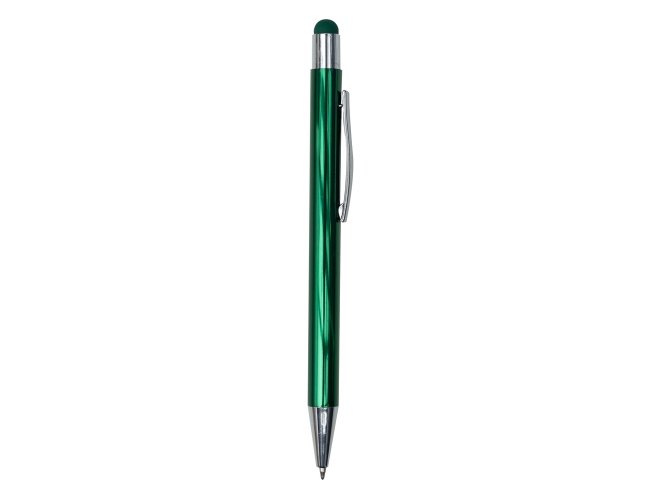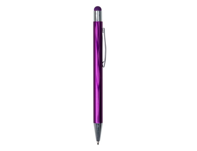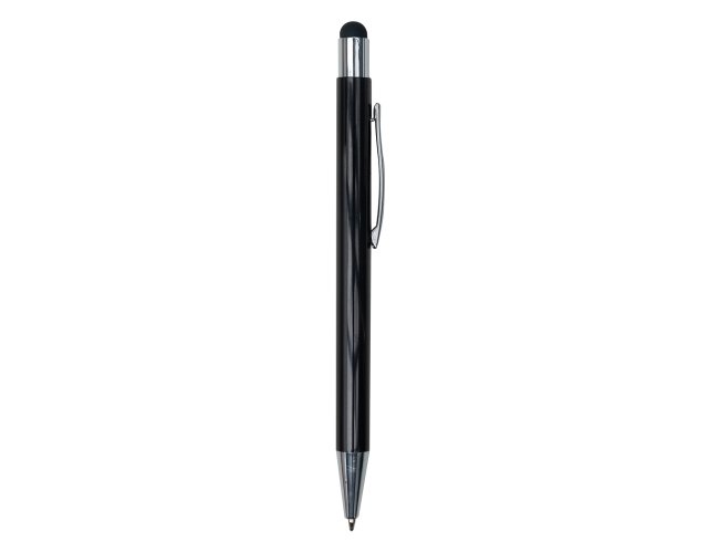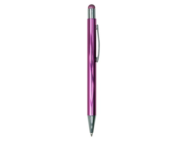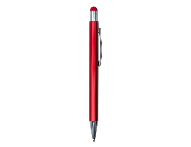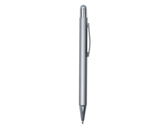 Caneta metálica com touch screen, carga esferográfica azul e acionamento por clique.