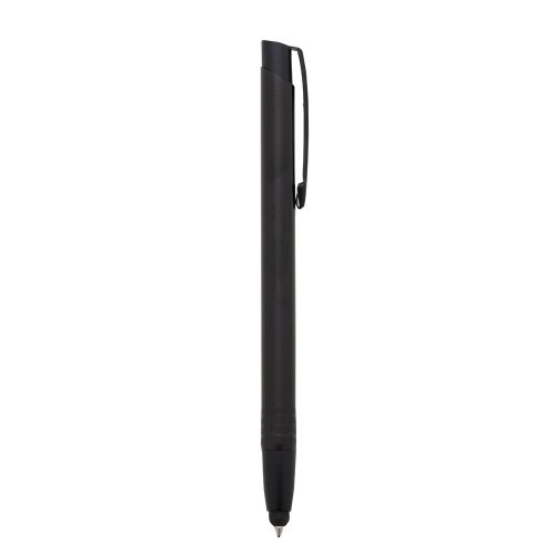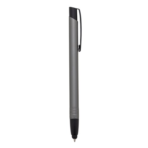 Caneta de metal colorida com detalhes preto e ponteira touch. Clip de metal, parte inferior possui quatro “anéis” em relevo. Aciona por clique, esferográfica sai por dentro da borracha touch.