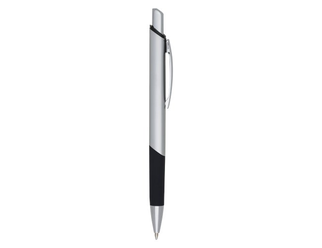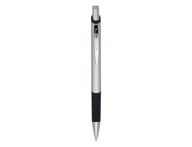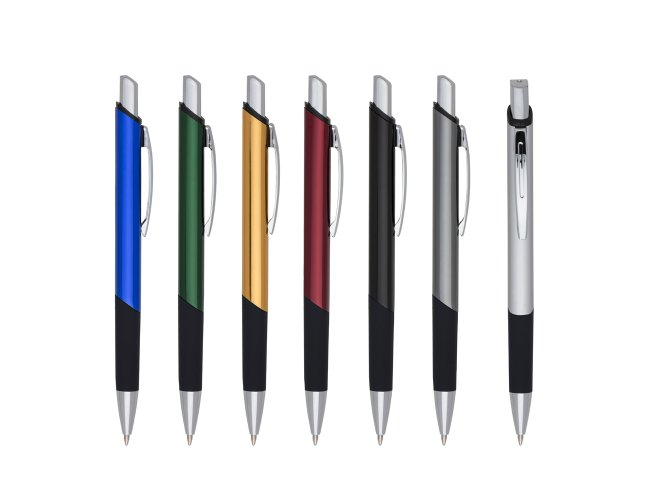 Caneta metal quadrangular, corpo colorido com pintura brilhante metalizada e detalhe emborracha preto na parte inferior. Clip de metal, aciona por clique.