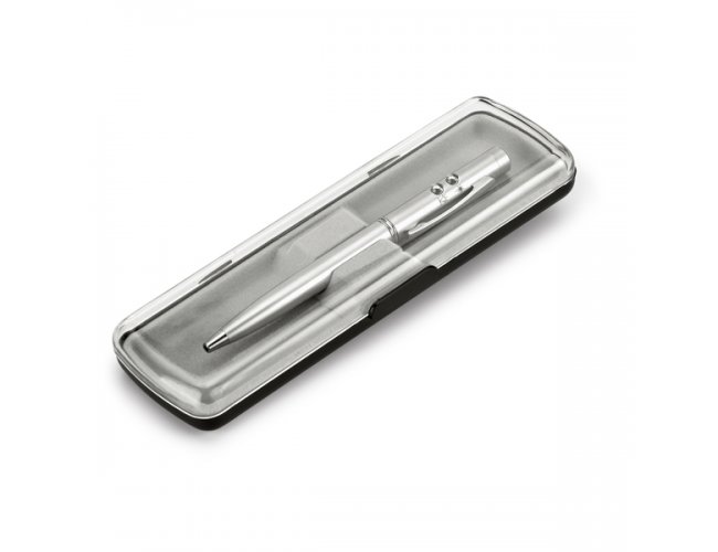 Caneta Metálica 91821 Personalizado . Com ponteira laser e LED. Incluso 3 pilhas LR41. 1,5km de escrita. Em estojo. Dimensões: 10 x 131 mm | Estojo: 170 x 50 x 20 mm.