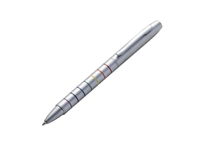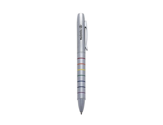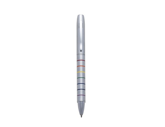 Caneta metal fosca inteira prata com sete linhas inferiores coloridas. Aciona por giro.