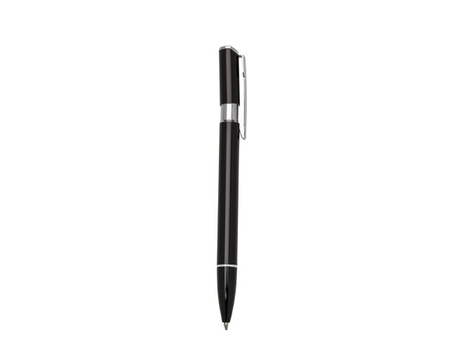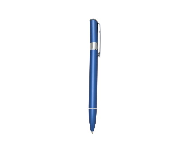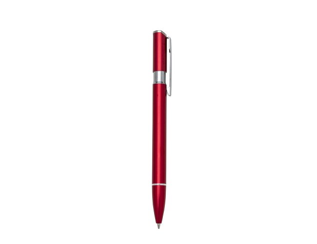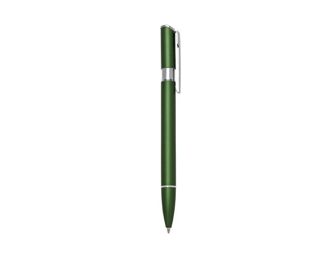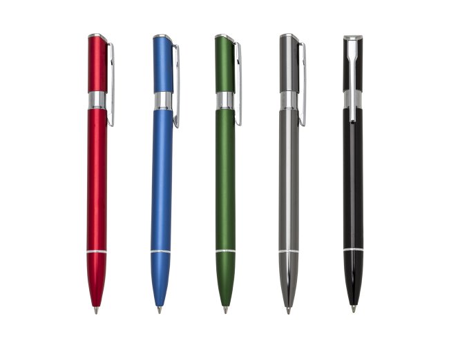 Caneta alumínio inteira colorida com detalhes prata. Possui clip de metal, parte superior e ao redor do clip detalhe prateado. Possui anel inferior prata e aciona por clique.