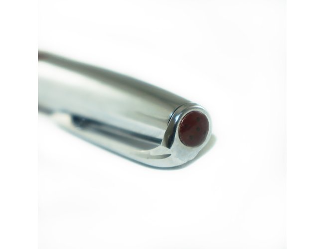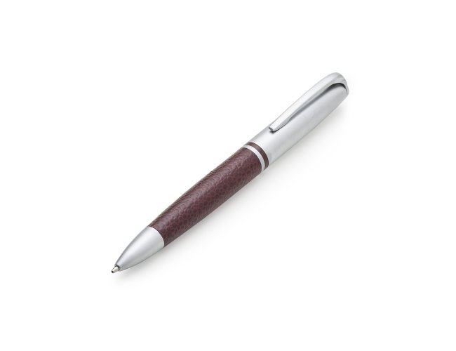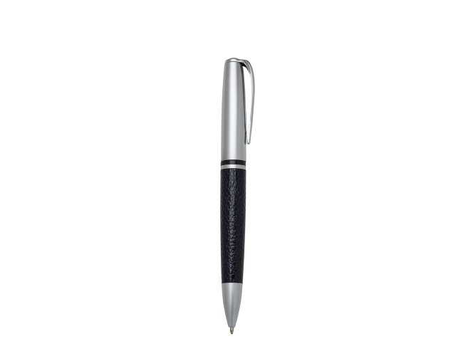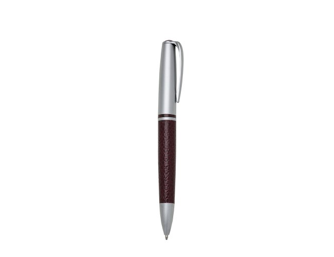 Caneta metal prata com detalhe em couro. Clip metal com a ponta colorida, possui anel central preto e dois anéis em relevo na ponteira. Possui as versões fosca e brilhante, aciona por giro.