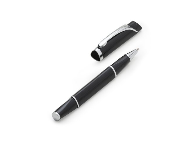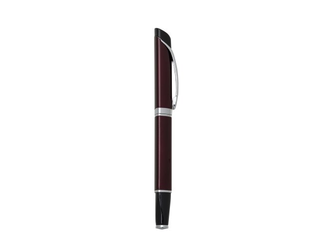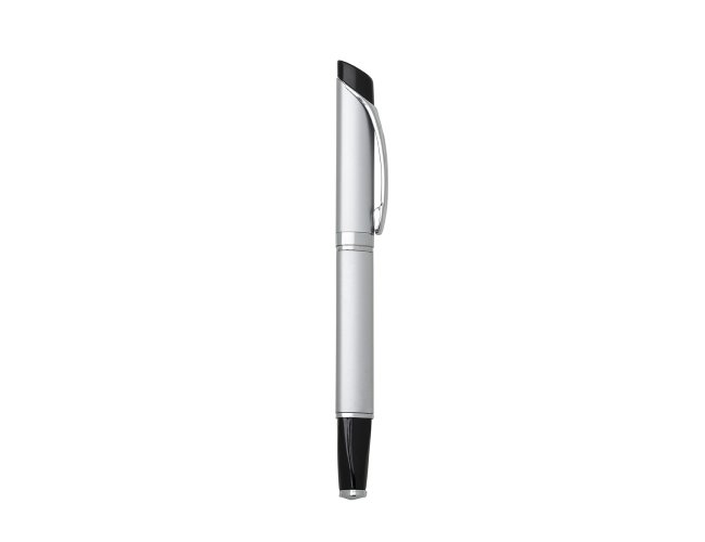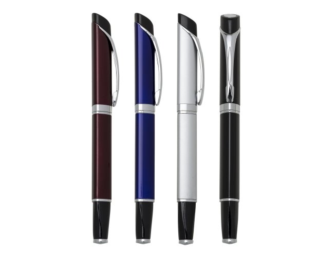 Caneta de metal triangular inteira colorida com tampa. Clip metal e possui um círculo prata na parte superior, possui anel prata no centro e na parte inferior. Pintura preta parte inferior com a ponta prateada. Tamanho total aproximado (CxD): 14 cm x 1,7 cm. Peso aproximado (g): 27
