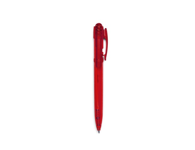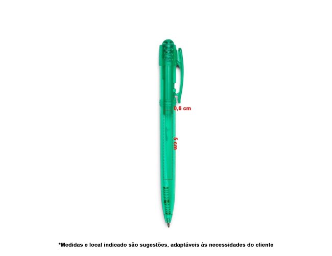 Caneta plástica translúcida com carga esferográfica azul 1.0 mm e acionamento por clique.