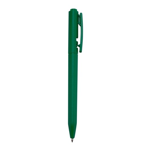 Caneta plástica inteira colorida com pintura fosca. Anel central e acionador em relevo. Aciona por clique e para destravar basta apertar a parte inferior do clip.