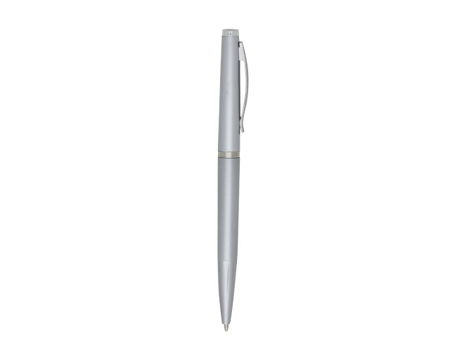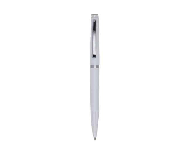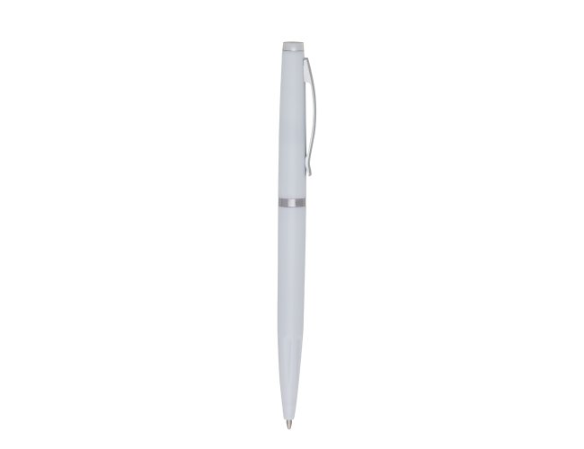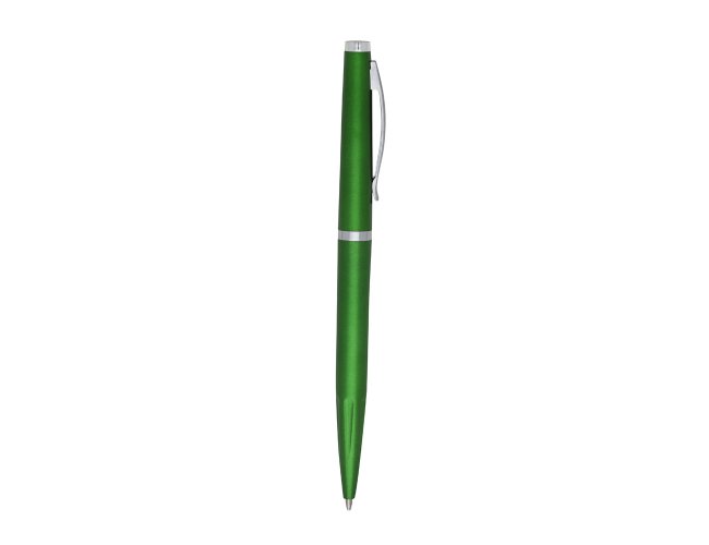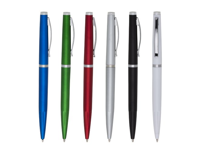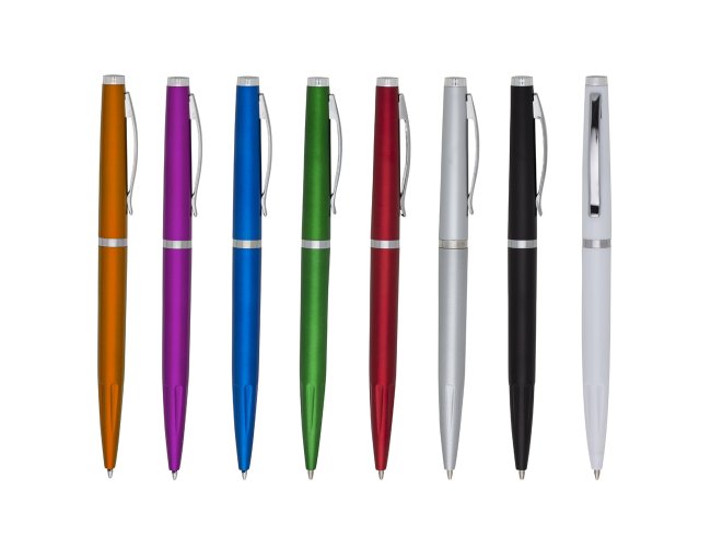 Caneta plástica com design fino, corpo colorido e detalhes em prata. Possui o clip em metal e parte inferior com relevo, aciona por giro.
