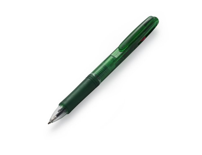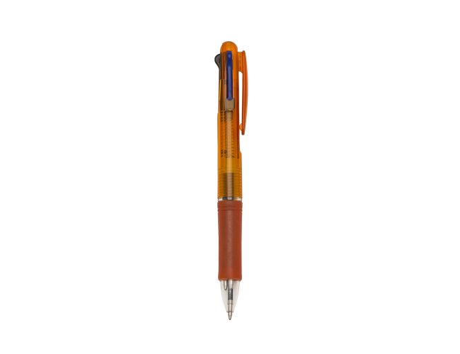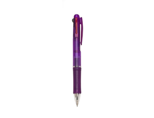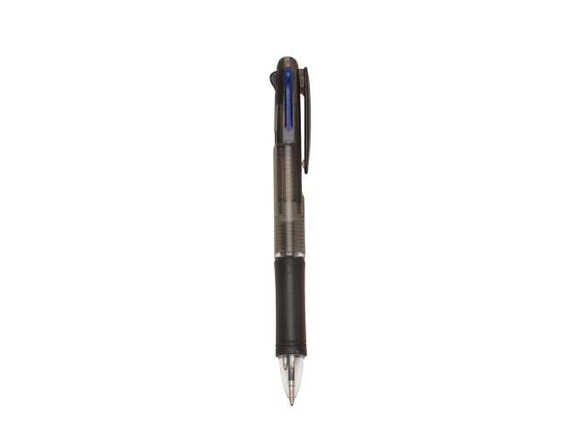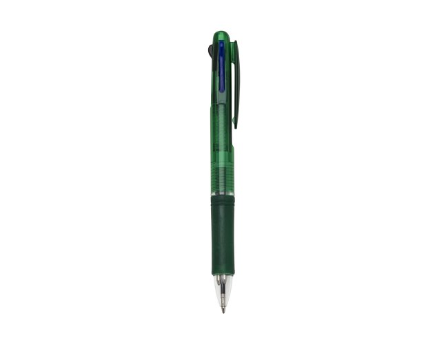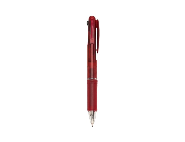 Caneta plástica de 3 cores(cargas: azul, preto e vermelho) inteira colorida com anel inferior e borracha colorida. Para acionar a cor desejada basta “descer o botão” com a cor respectiva, para destravar basta apertar pressionar outra cor.