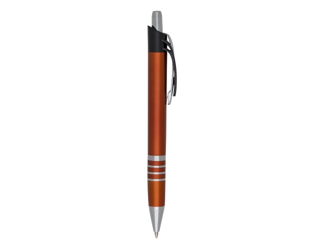 Caneta plástica inteira colorida com detalhes prata. Possui clip de metal com detalhe plástico preto, parte inferior com três anéis coloridos. Aciona por clique. Tamanho total aproximado (CxD): 14,2 cm x 1,7 cm. Peso aproximado (g): 11