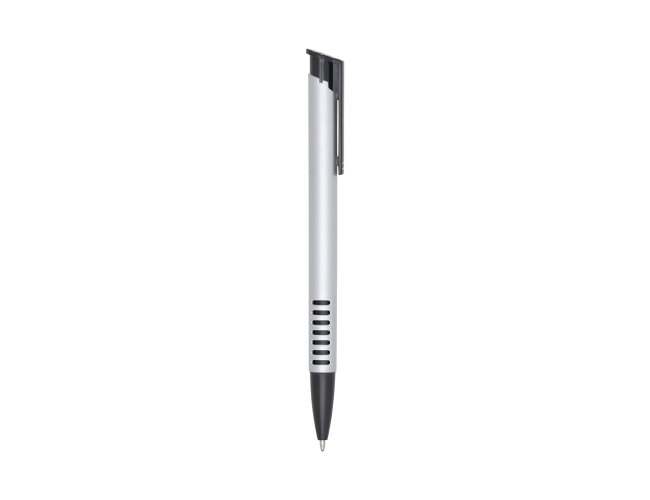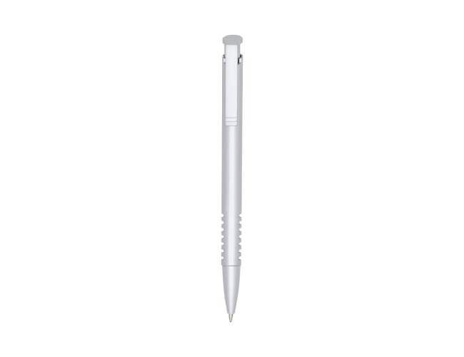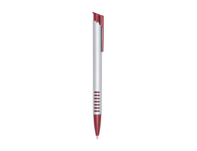 Caneta plástica corpo prata com detalhes coloridos. Clip plástico colorido e parte inferior com sete linhas coloridas. Aciona por clique.
