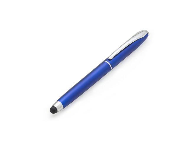 Caneta plástica touch inteira colorida com detalhes em prata. Possui tampa e clip de metal, anéis: superior, central e inferior em prata. Para utilizar esferográfica basta tirar a tampa, touch fica do lado oposto.