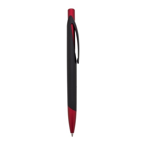 Caneta plástica preta fosca com detalhes coloridos. Clip plástico com detalhe vazado interno, aciona por clique.