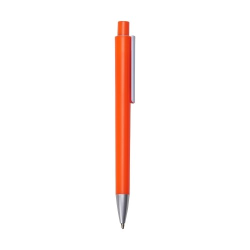 Caneta plástica colorida com clip branco. Parte superior do acionador com detalhe circular branco, ponteira prateada. Aciona por clique.