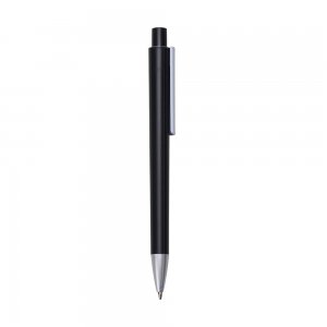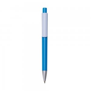 Caneta plástica colorida com clip branco. Parte superior do acionador com detalhe circular branco, ponteira prateada. Aciona por clique.
