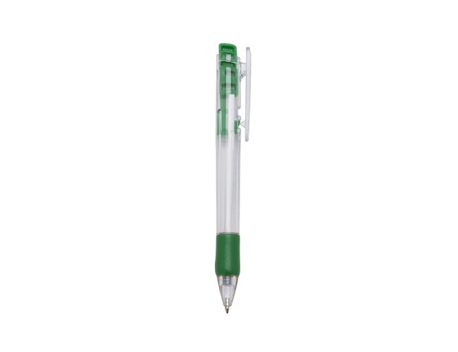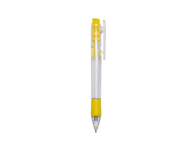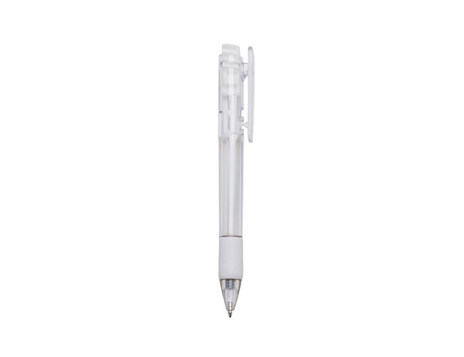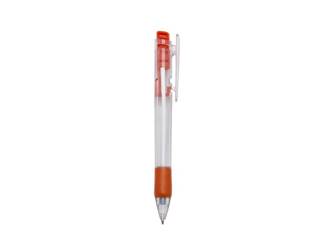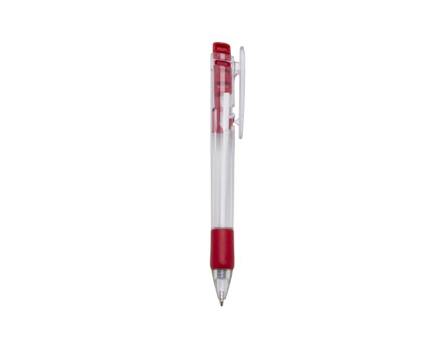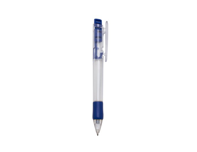Caneta plástica inteira transparente com detalhes emborrachado e clip coloridos. Possui dois traços vazados na parte superior e acionador com detalhes em relevo. Aciona por clique, para destravar bastar pressionar o clip.