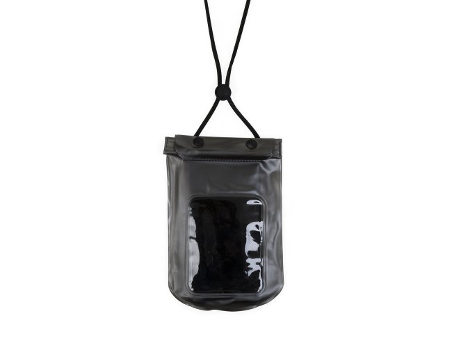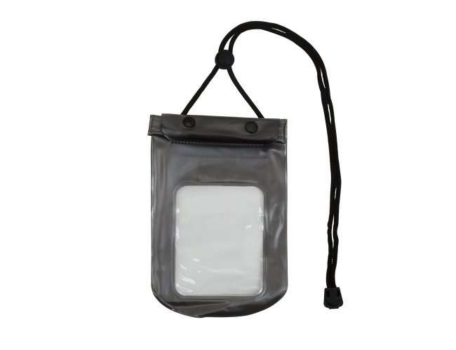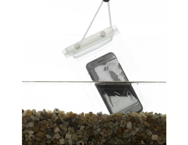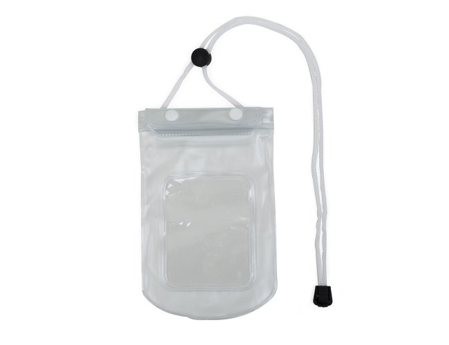 Descrição: Capa a Prova D'Água para Celular Universal 13137, fechamento á vácuo e através de abotoamento, com cordão de nylon, fabricado em PVC.