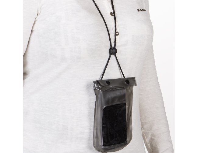 Capa a Prova D'Água para Celular Universal 13137, fechamento á vácuo e através de abotoamento, com cordão de nylon, fabricado em PVC. Tamanho total aproximado (CxD): 24 cm x 12,5 cm. Peso aproximado (g): 40