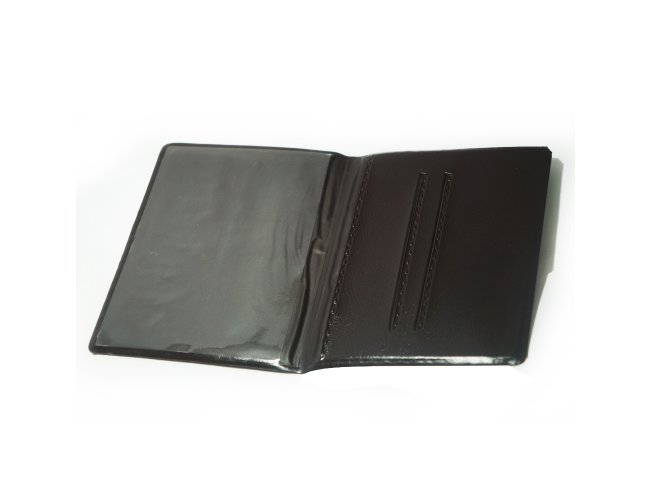 Carteira porta documento em couro sintético de frente e verso liso, parte interna com bolso plástico e duas divisórias para cartões.
