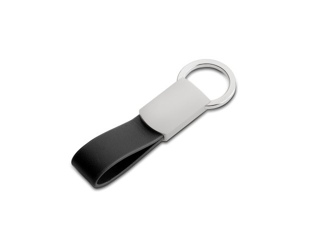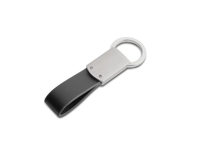 Chaveiro de metal fosco com alça em couro sintético preto + caixa com berço aveludado