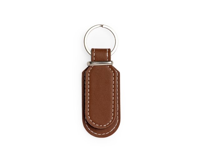 Chaveiro de couro sintético com detalhe em metal e frente e verso lisos.