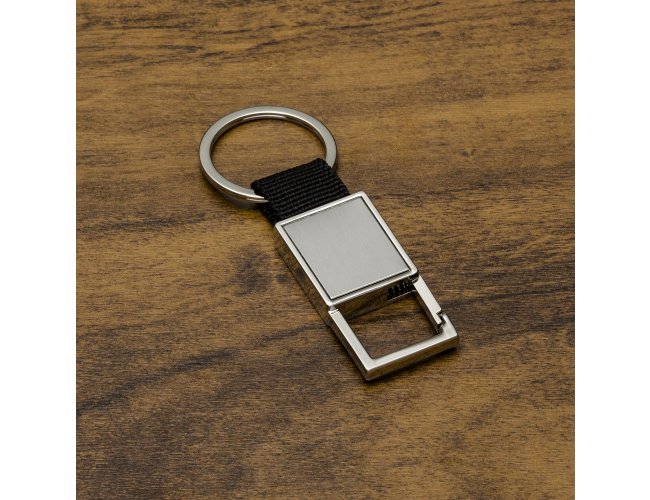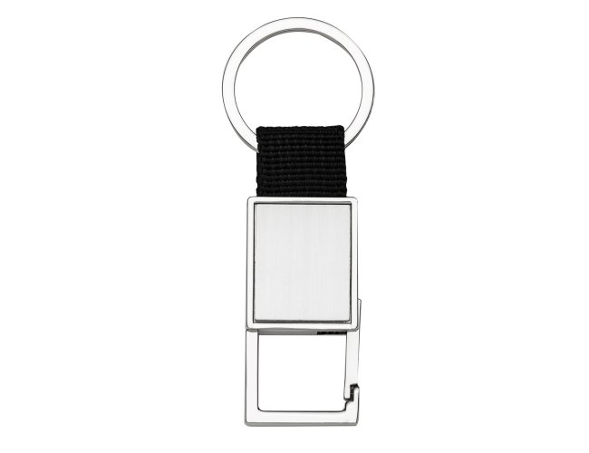 Chaveiro de metal com mosquetão(sem trava), chapa central em inox e alça de nylon.