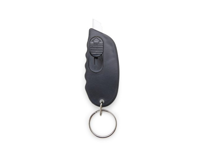 Chaveiro estilete projetado em plástico com sistema de retração automática para maior segurança. Após o uso, basta soltar o botão e a lâmina retorna automaticamente à posição de armazenamento, minimizando o risco de acidentes.