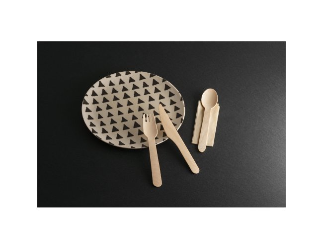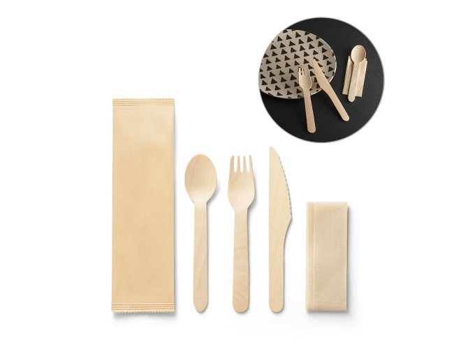 Conjunto de talheres descartáveis em madeira composto por: garfo, faca e colher. Incluso guardanapo em kraft.