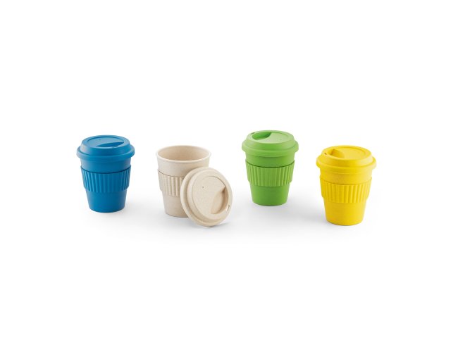 Copo de viagem. Fibra de bambu e PP. Capacidade: 380 ml. Food grade. Retirar tampa antes de colocar no micro-ondas. Dimensões: 95 x 95 x 114 mm.