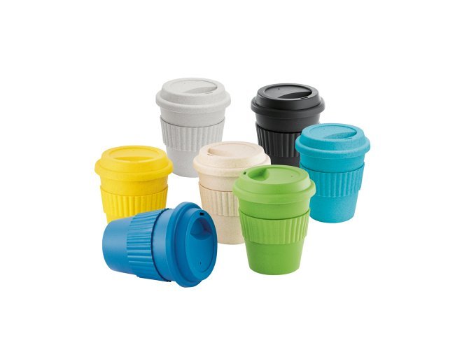 Copo de viagem. Fibra de bambu e PP. Capacidade: 380 ml. Food grade. Retirar tampa antes de colocar no micro-ondas. Dimensões: 95 x 95 x 114 mm.