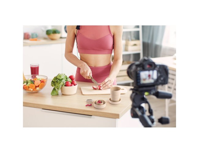 Copo de viagem retrátil em fibra de bambu (50%) e PP (50%) com capacidade até 210 ml.