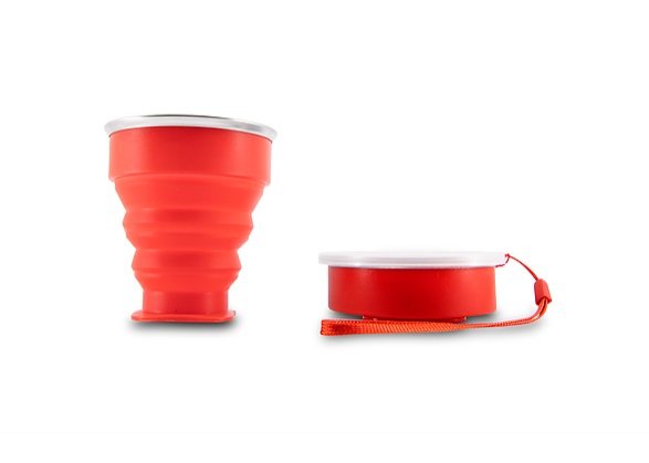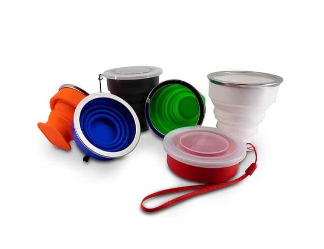 Copo expansível Material: Silicone de grau alimentar. Capacidade 240ml. Bocal de Inox e Tampa em PVC flexível. Possui cordão para transporte. 80(Diam) x 90(Altura) mm (expandido).