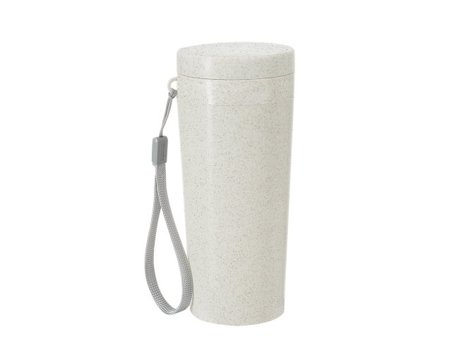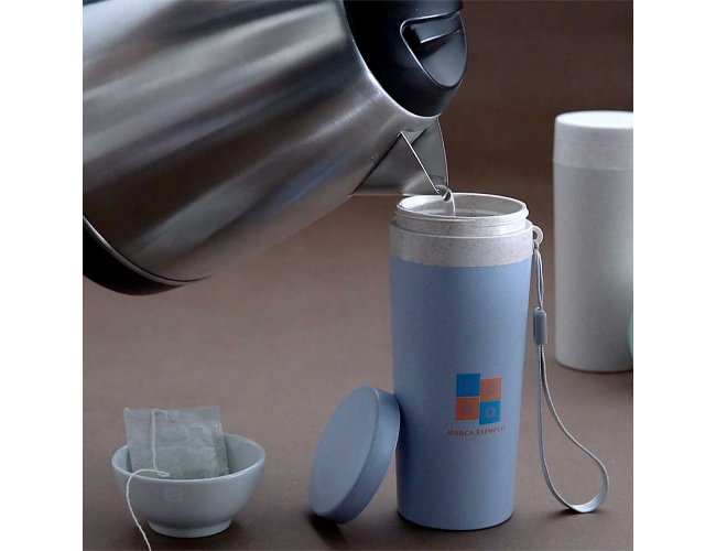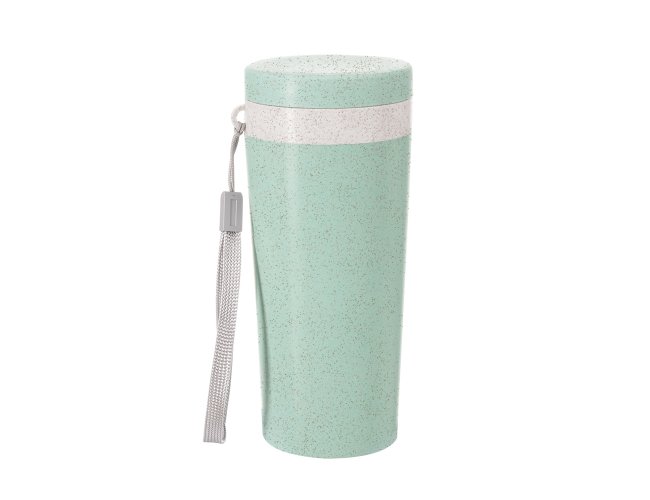Copo fibra de bambu 350ml com parede dupla e alça. Copo produzido em Polipropileno livre de BPA, possui uma tampa de vedação rosqueável e alça de nylon (removível) para transporte. Conserva a temperatura interna durante um período de 1 à 2 horas, mas não dispõe de isolamento térmico. O copo pode ser levado a lava-louças, geladeiras e micro-ondas.