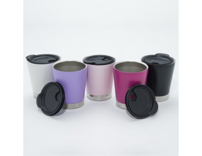 Copo de parede dupla em inox 304 com capacidade de 300ml, possui tampa plástica de encaixe com acesso ao bocal e área para canudo (não acompanha).