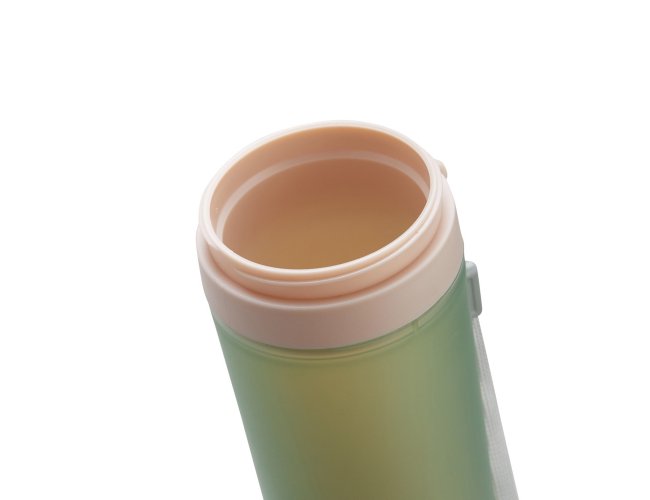 Copo de plástico polipropileno com capacidade para 350ml livre BPA, parede dupla. Acompanha tampa rosqueável e alça de nylon para transporte.