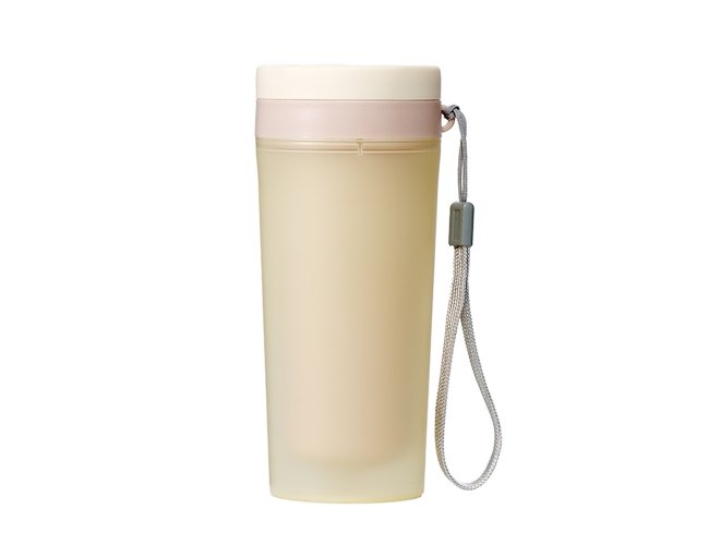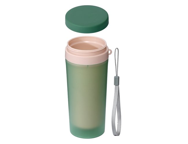Copo de plástico polipropileno com capacidade para 350ml livre BPA, parede dupla. Acompanha tampa rosqueável e alça de nylon para transporte.