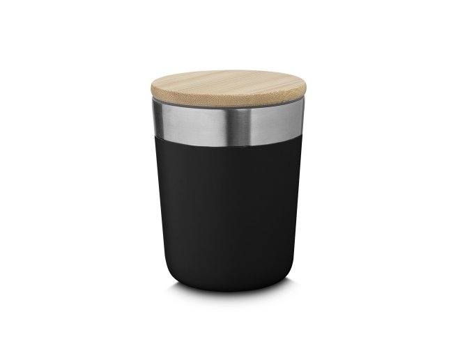 Copo térmico em aço inox, pintura fosca, detalhe em aço inox, tampa em bambú com anel de silicone para vedação, capacidade de 300ml.