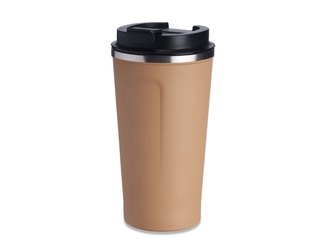 Copo térmico de inox 500ml com parede dupla, parte inferior com borracha antideslizante e tampa rosqueável com abertura de bocal.