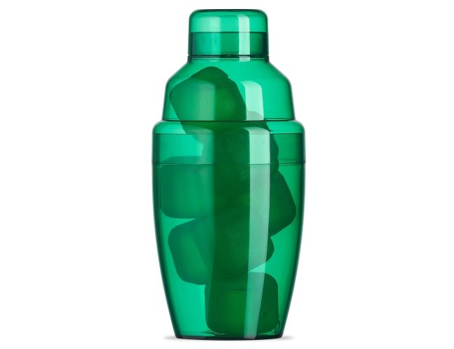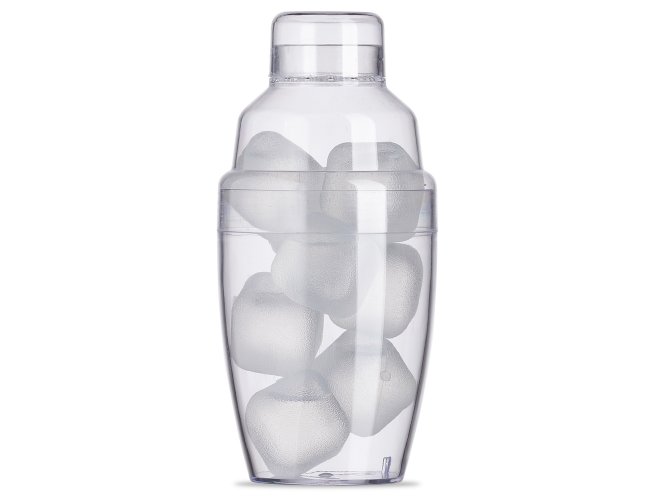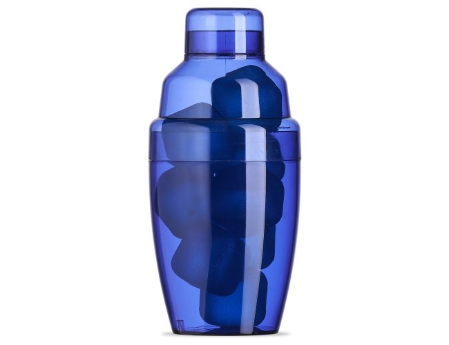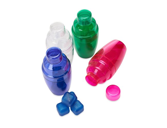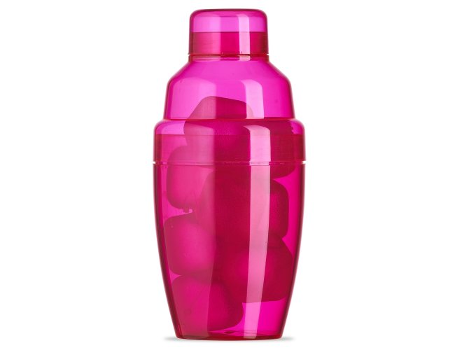 Coqueteleira plástica 230ml com gelo ecológico. Material colorido translúcido, possui tampa de encaixe com peneira e tampa protetora para bocal da peneira. Acompanha 8 gelos ecológicos coloridos. Obs.: Quantidade máxima 130ml com 6 cubos de gelo.
