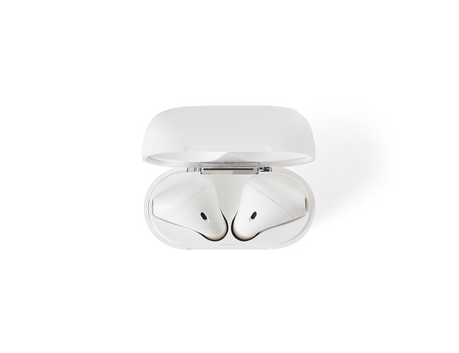 Fone de ouvido bluetooth com comandos touch, microfone e case carregador de fechamento magnético. Fones e case com acabamento brilhante, acompanha USB Lightning.