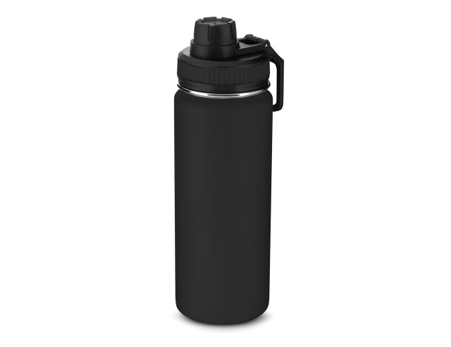Garrafa em aço inox com capacidade de até 780 ml. Tampa rosqueável, alça em plástico e anel de silicone para vedação. Design com frisos na tampa e pintura pó.