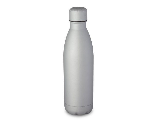 Garrafa fosca em aço inox com capacidade de até 750 ml. Tampa rosqueável e anel de silicone para vedação. Design com frisos na tampa.