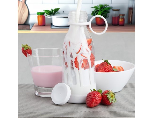 Mini liquidificador portátil com capacidade de 380ml. Contém tampa rosqueável plástica com alça emborrachada para transporte, ventoinha inox 6 lâminas e base plástica com borrachas antiderrapantes. Acompanha cabo USB. Obs. (Para o funcionamento do produto a quantidade total de frutas/água adicionadas não deve exceder 300ml).