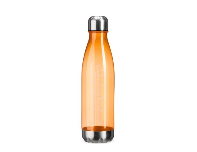 Garrafa plástica translúcida com capacidade máxima de 750ml e marcação de volume até 700ml. Conta ainda com base e tampa rosqueável em alumínio.