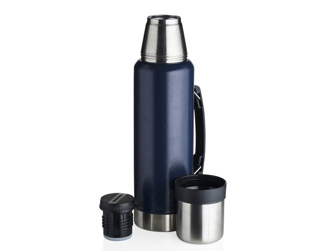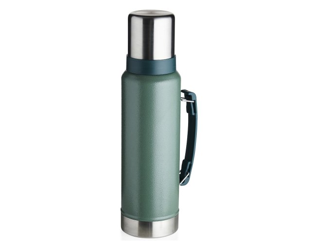 Descrição: Garrafa térmica de inox livre de BPA com capacidade de 1,4 litro. Contém alça para transporte e pintura texturizada.