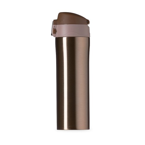 Garrafa térmica 450ml colorida com sistema de trava. Material metálico com revestimento interno em inox, parte inferior com borracha anti deslizante; possui tampa plástica fosca com borracha interna para vedação evitando o vazamento de líquido e prezando sua temperatura; possui botão central para abertura e trava lateral.