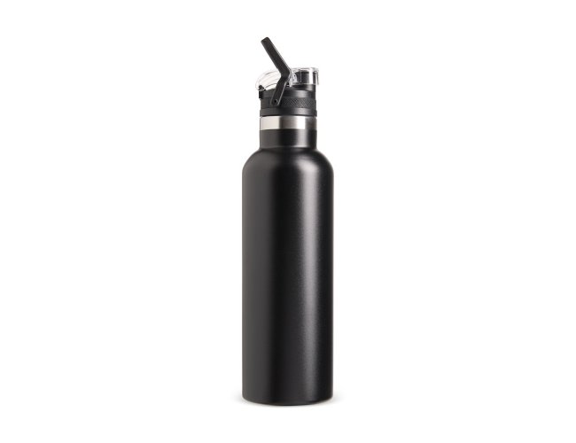Garrafa térmica em inox 304 com capacidade de até 800ml. Possui estrutura de parede dupla e vedação a vácuo, permitindo conservar a temperatura de bebidas por mais tempo. Apresenta uma tampa rosqueável em plástico com protetor para o bocal e trava de segurança integrada à alça.