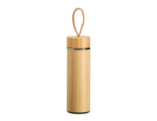 Garrafa térmica de bambu e inox 400 ml e infusor de metal. Contém tampa rosqueável de bambu e alça de tecido embutida.