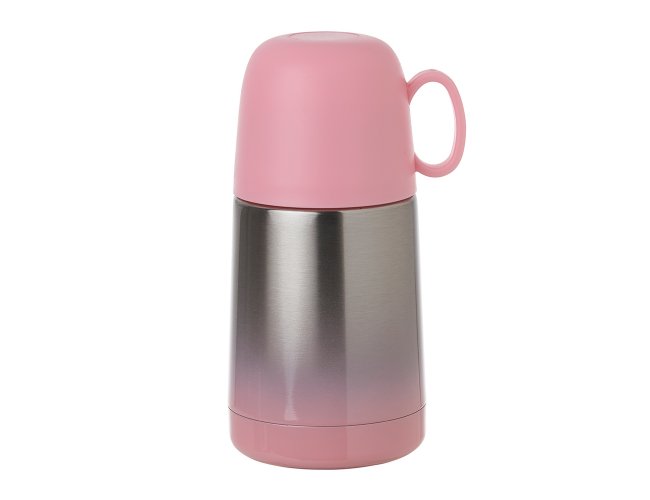 Garrafa térmica 250ml com acabamento degradê, contém tampa hermética rosqueável com botão de acionamento e tampa externa plástica com alça, podendo ser utilizada como xícara.
